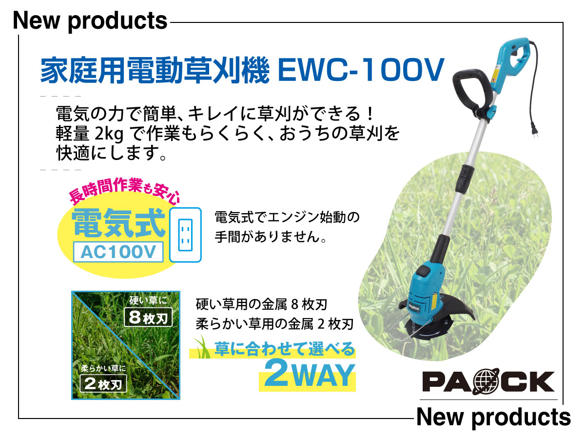 2026年03月5日 新製品【家庭用電動草刈機 EWC-100V】発売のお知らせ 新製品【家庭用電動草刈機 EWC-100V】が発売になりました。 家庭用電動草刈機 EWC-100V 製品ページはこちら
