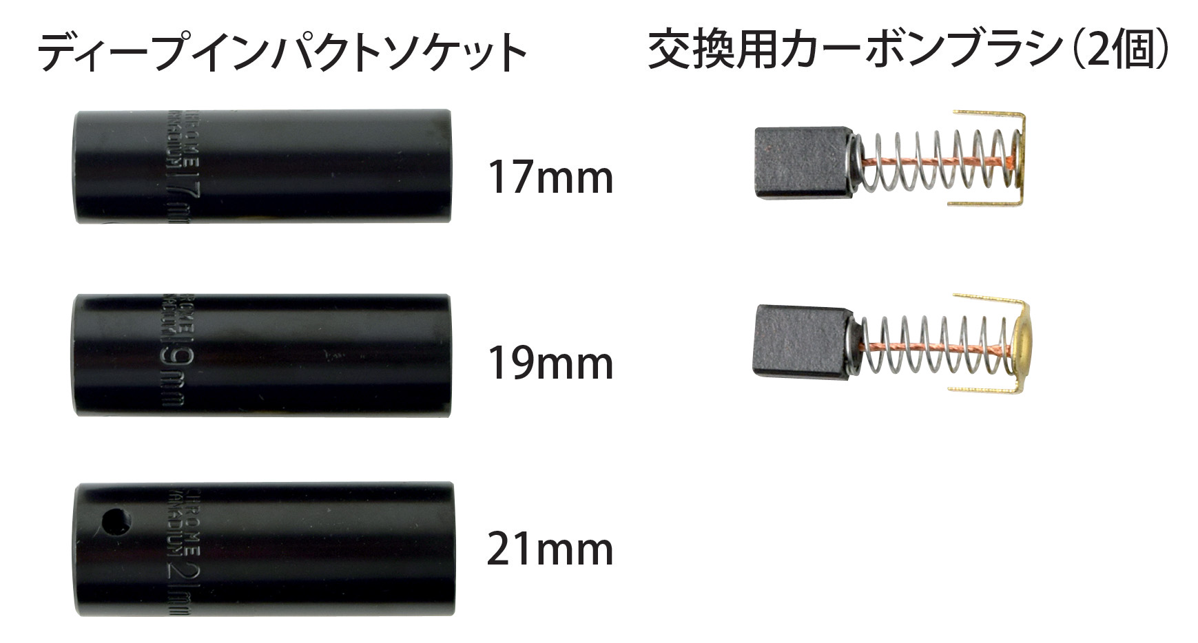 - インパクトレンチ用ディープソケット:17mm、19mm、21mm